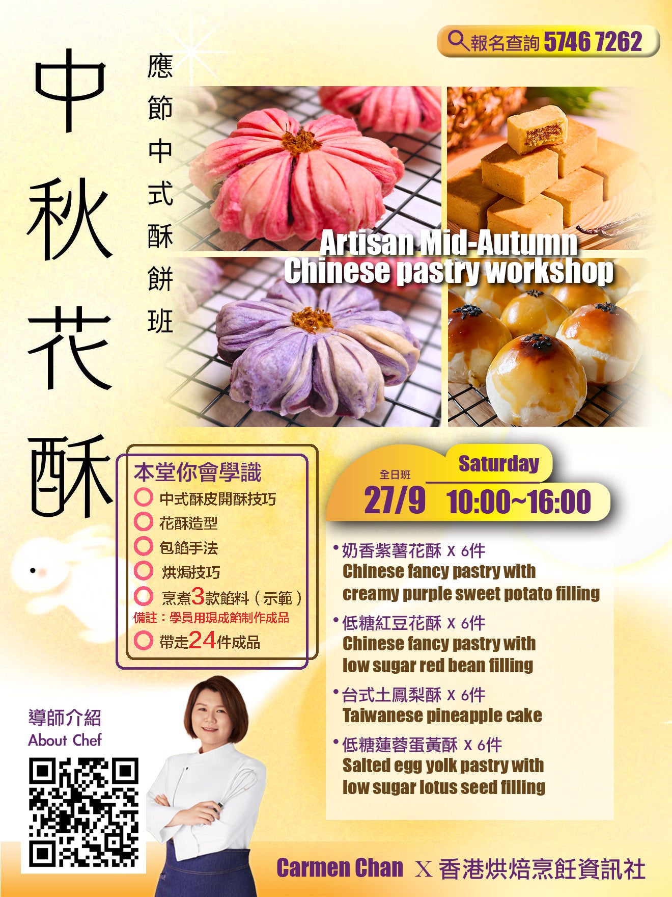 由資深甜品導師Carmen Chan聯同「香港烘焙烹飪資訊社」,推出《中秋花酥・應節中式酥餅班》,將於27/9(六)開班。