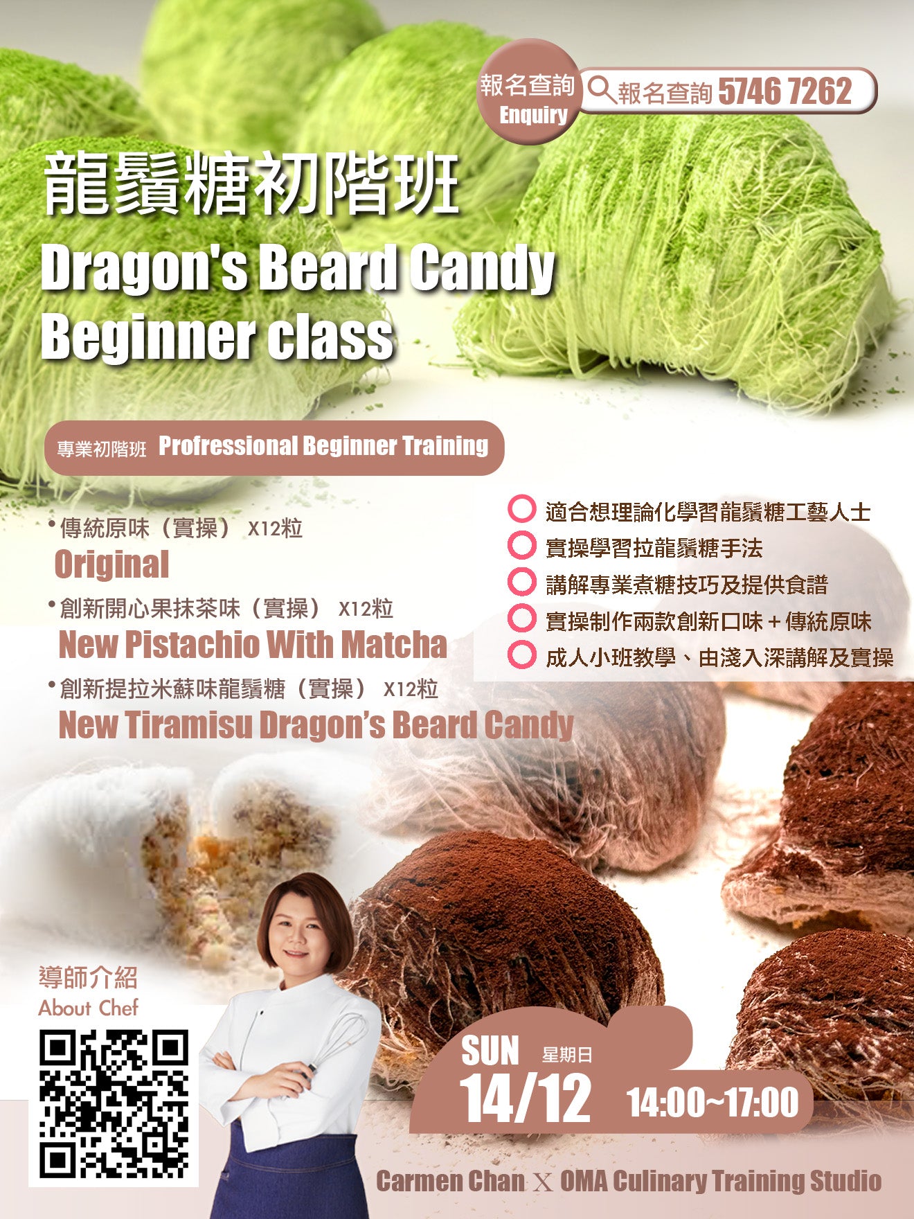 由資深甜品導師Carmen Chan聯同「OMA Culinary Training Studio」,推出《龍鬚糖專業初階班》,將於14/12(二)開班。